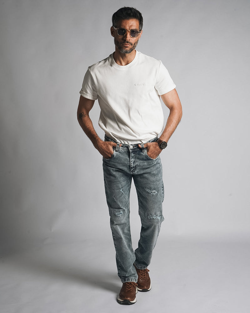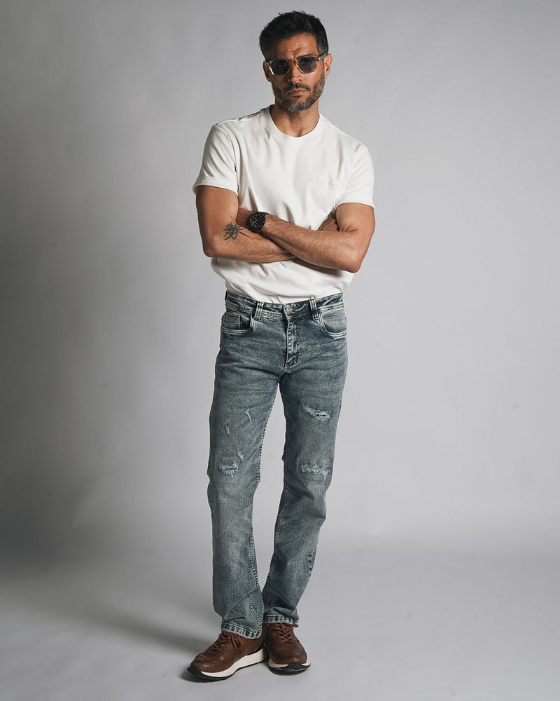 Lavado medio claro con rotos reforzados que suman carácter sin volverse juveniles. Un Regular Fit pensado para hombres que quieren verse modernos, actuales y con buena presencia, pero sin caer en excesos.